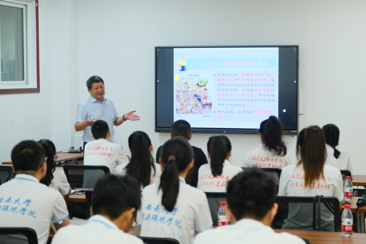 在出征仪式上,侯老员工谢德体教授结合图片,从生平、科研、教学三个方面向大家介绍侯光炯院士。他提到,有一天接侯老到西南农业大学上课的车未按时到达,那时通讯不便,无法联系,他在谢教授的陪同下从长宁出发彻夜赶路,只为第二天早上能按时授课。谢教授带领大家一起回顾了侯光炯院士留下的珍贵科学遗产和宝贵精神财富。随后,大家前往参观bibo必博官方网站光炯纪念馆,进一步了解光炯精神。