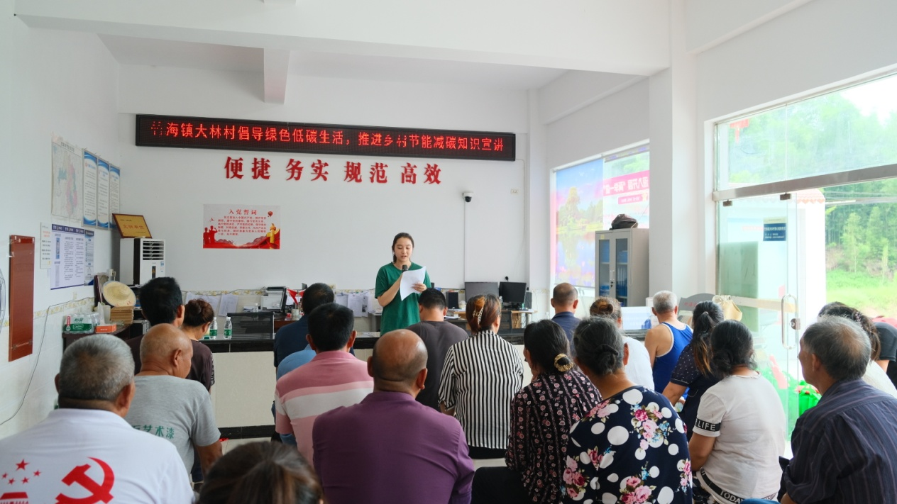 7月3日14:00,实践团成员到达宜宾市长宁县竹海镇大林村。在大林村服务中心,实践团成员郗琪以宣讲的形式,向村民普及节能减碳方法,提倡保护生态环境,呼吁村民践行低碳生活,助力“碳达峰碳中和”目标的实现。 随后,实践团成员深入村屯农家,走访调研,向村民宣传科普绿色低碳生活方式。
